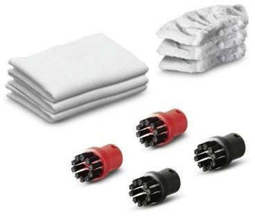 Zestaw akcesoriów do parownic. W skład zestawu wchodzą: trzy bawełniane ściereczki podłogowe, trzy bawełniane powłoczki na dyszę ręczną, dwie czerwone i dwie czarne okrągłe szczotki.