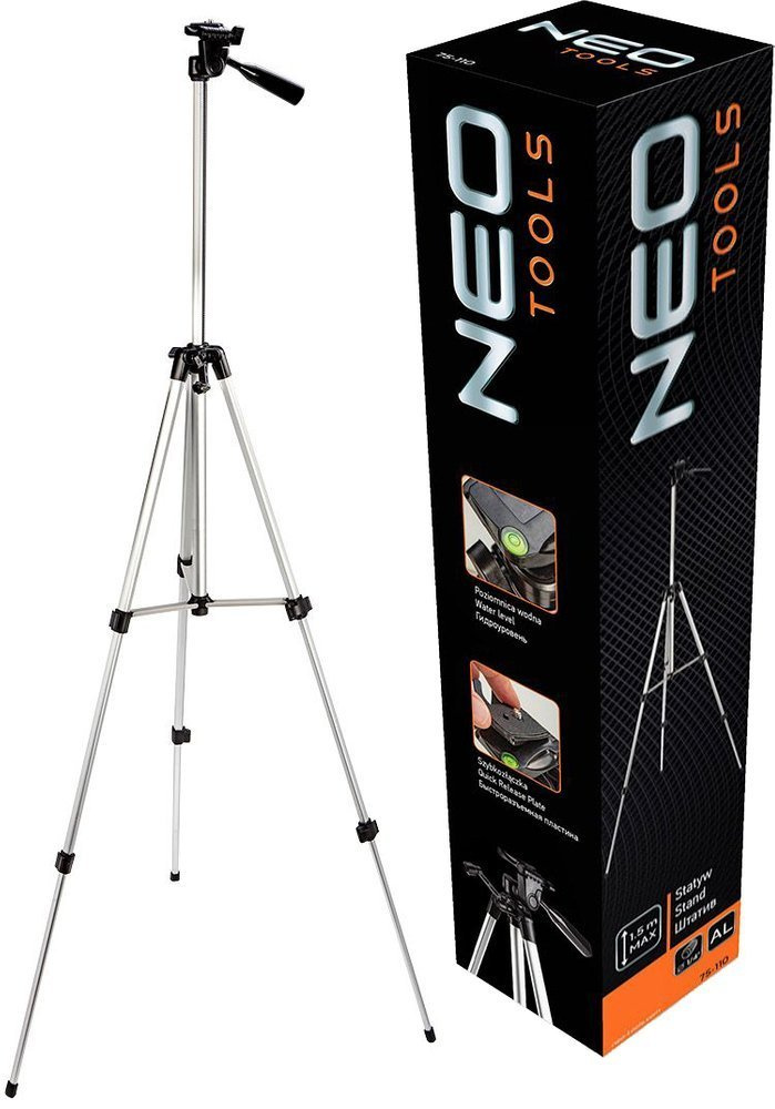 Statyw (gwint 1/4") charakteryzuje lekka a zarazem wytrzymała, aluminiowa konstrukcja. Teleskopowe nogi blokowane zaciskami oraz regulowana głowica zapewniają dużą stabilność oraz pozwalają ustawić wysokość statywu aż do 150 cm . Urządzenie wyposażone jest w libelkę do poziomowania głowicy. Szybkozłączka pokryta jest gumową powierzchnią, co wpływa na dodatkową stabilizację oraz zabezpiecza sprzęt współpracujący przed zarysowaniami. Statyw doskonale sprawdzi się w pracy z dalmierzami oraz laserami krzyżowymi i płaszczyznowymi. Marka NEO spełnia oczekiwania profesjonalistów.