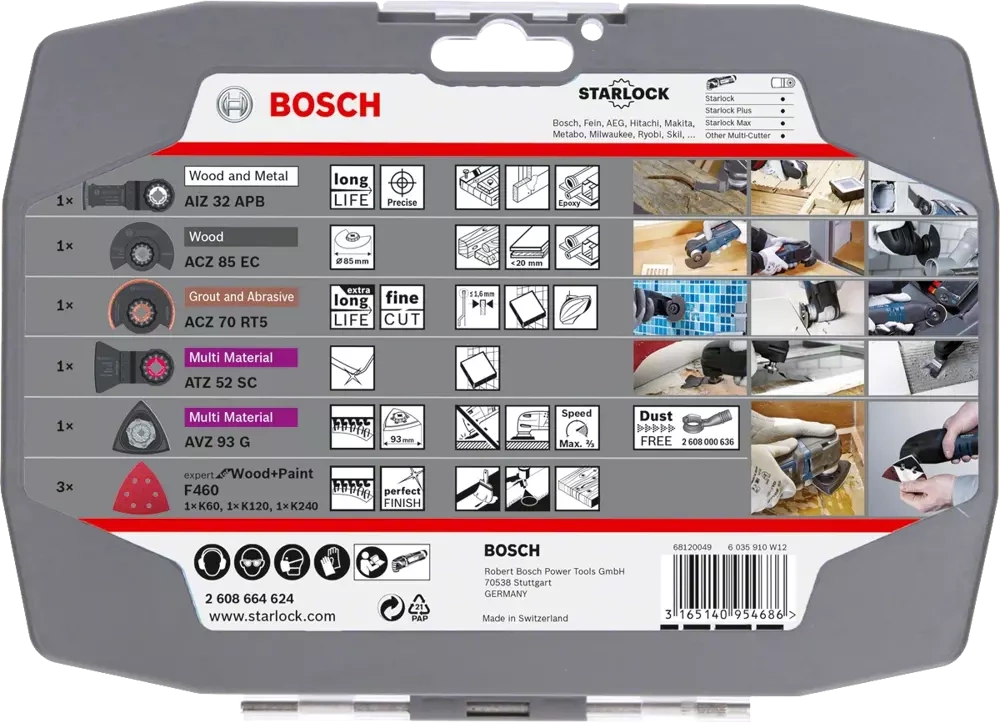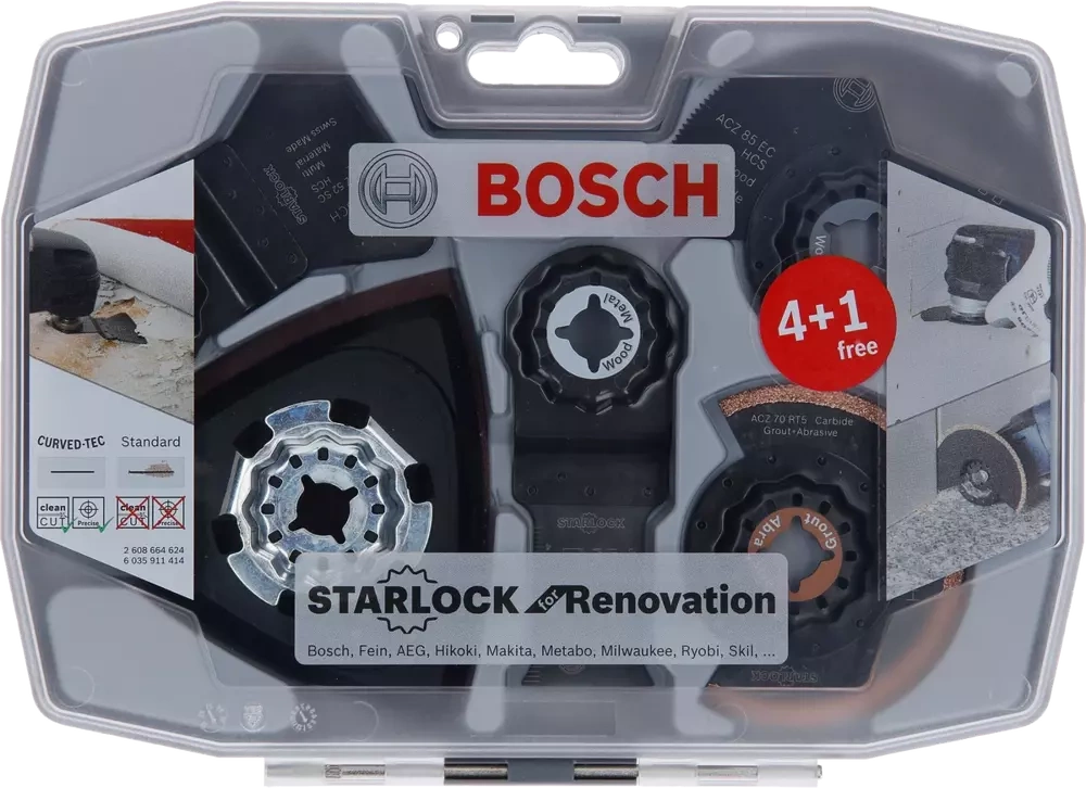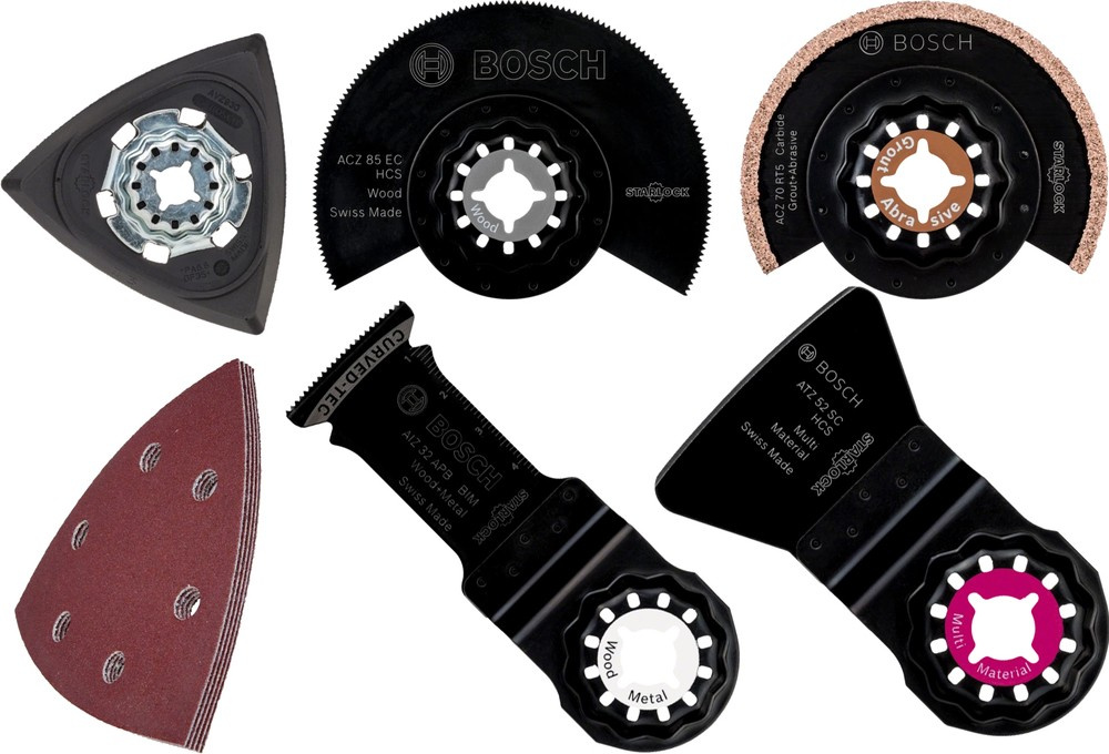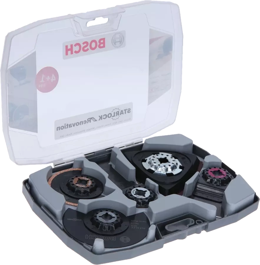Zestaw osprzętu do narzędzi wielofunkcyjnych Bosch składa się z brzeszczotów, skrobaka i stopy szlifierskiej wraz z papierami ściernymi. Kompletacja ta jest rekomendowana użytkownikom do prac renowacyjnych. Osprzęt znajduje się w praktycznej kasecie z tworzywa sztucznego, która zapewnia wygodne i bezpieczne przechowywanie i transportowanie akcesoriów. Dzięki uniwersalnemu mocowaniu Starlock, osprzęt pasuje zarówno do narzędzi wielofunkcyjnych Bosch, jak i do multitooli wielu innych producentów.