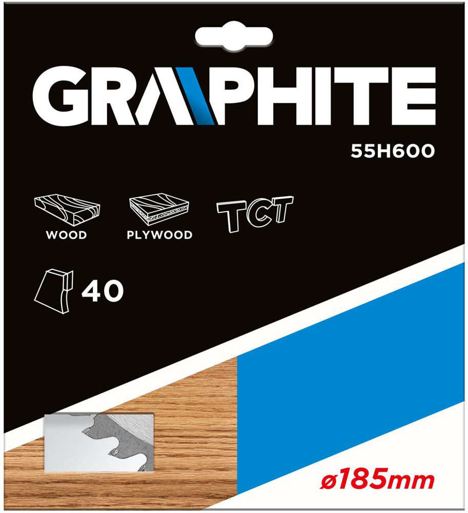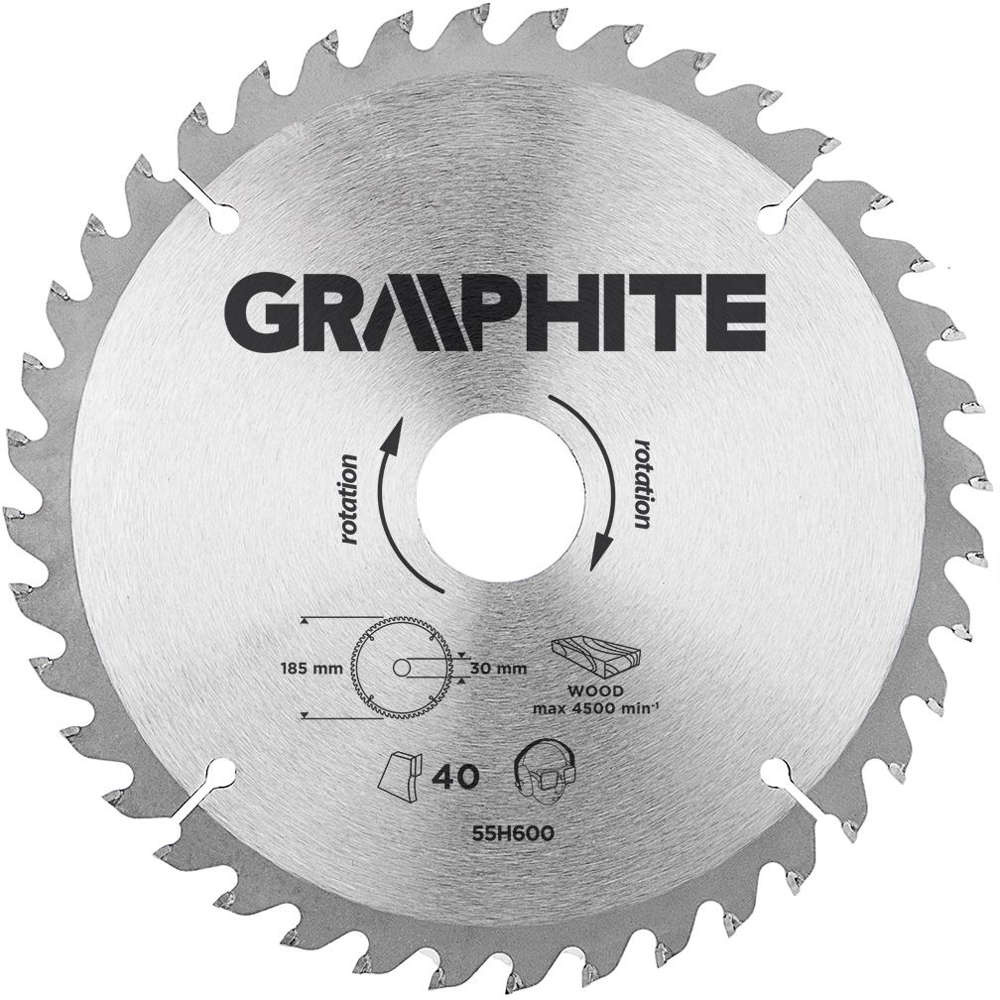 Tarcza do pilarki widiowa GRAPHITE (nr ref. 55H600 ) o średnicy zewnętrznej 185 mm, wykonana ze stopu stali manganowej MN65 o dużej odporności na temperaturę i odkształcenia. Zęby z nakładkami z węglika spiekanego YG6A pozwalają na zgrubne cięcie drewna i materiałów drewnopochodnych, takich jak sklejka, płyta wiórowa, MDF. Zawarte w opakowaniu pierścienie redukcyjne umożliwiają zastosowanie tarczy do większości modeli pilarek.