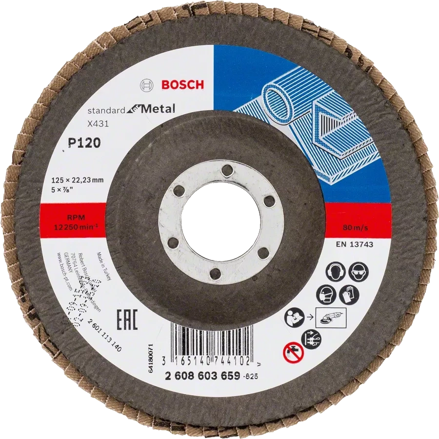 - Tarcza listkowa do metalu wypukła Bosch o średnicy 125 x 22,23 mm i ziarnistości G120 X431