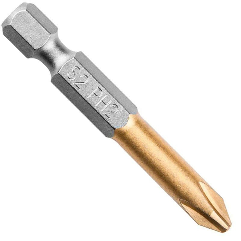 Końcówka wkrętakowa GRAPHITE (nr ref. 57H979) typu PH2, przeznaczona do wkręcania/wykręcania wkrętów i śrub z łbem typu Phillips o rozmiarze 2 mm. Pokrycie powierzchni końcówki azotkiem tytanu (złoty kolor) znacząco przedłuża żywotność narzędzia poprzez utwardzenie punktu styku z łbem śruby. Zwiększona długość końcówki pozwala na zastosowanie narzędzia do śrub i wkrętów umieszczonych w głębokich gniazdach.