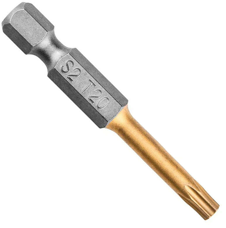 Końcówka wkrętakowa GRAPHITE typu TX20, przeznaczona do wkręcania/wykręcania wkrętów i śrub z łbem typu Torx o rozmiarze 20 mm. Pokrycie powierzchni końcówki azotkiem tytanu (złoty kolor) znacząco przedłuża żywotność narzędzia poprzez utwardzenie punktu styku z łbem śruby. Zwiększona długość końcówki pozwala na zastosowanie narzędzia do śrub i wkrętów umieszczonych w głębokich gniazdach.