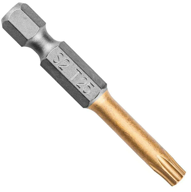 Końcówka wkrętakowa GRAPHITE typu TX25, przeznaczona do wkręcania/wykręcania wkrętów i śrub z łbem typu Torx o rozmiarze 25 mm. Pokrycie powierzchni końcówki azotkiem tytanu (złoty kolor) znacząco przedłuża żywotność narzędzia poprzez utwardzenie punktu styku z łbem śruby. Zwiększona długość końcówki pozwala na zastosowanie narzędzia do śrub i wkrętów umieszczonych w głębokich gniazdach.