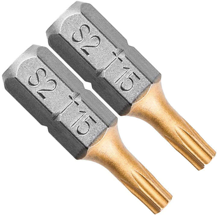 Końcówki wkrętakowe GRAPHITE typu TX15, przeznaczone do wkręcania/wykręcania wkrętów i śrub z łbem typu Torx o rozmiarze 15 mm. Pokrycie powierzchni końcówek azotkiem tytanu (złoty kolor) znacząco przedłuża żywotność narzędzia poprzez utwardzenie punktu styku z łbem śruby.