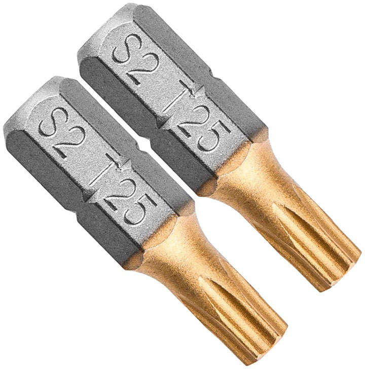 Końcówki wkrętakowe GRAPHITE typu TX25, przeznaczone do wkręcania/wykręcania wkrętów i śrub z łbem typu Torx o rozmiarze 25 mm. Pokrycie powierzchni końcówek azotkiem tytanu (złoty kolor) znacząco przedłuża żywotność narzędzia poprzez utwardzenie punktu styku z łbem śruby.