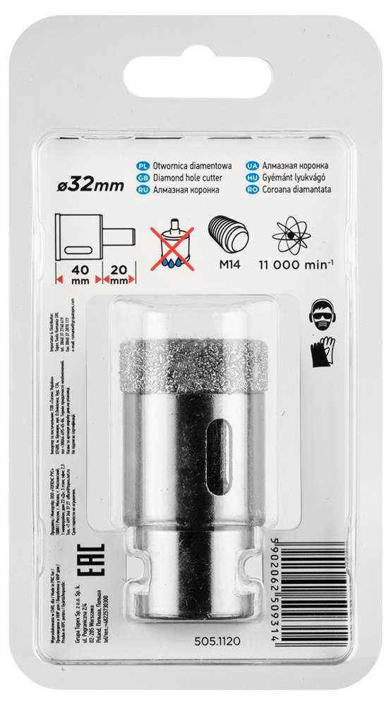 Otwornica diamentowa 32 mm x M14, wykorzystuje moc ścierną diamentu do wiercenia otworów w twardych materiałach. Została wykonana w technologii lutowania próżniowego, co zapewnia wysoką prędkość wiercenia oraz zwiększoną trwałość użytkową. Boczne otwory gwarantują optymalne chłodzenie oraz odprowadzanie pyłu w trakcie pracy a dla jeszcze lepszego chłodzenia otwornice zostały wypełnione parafiną. Przeznaczone są do pracy na sucho, na gwincie M14 do współpracy ze szlifierkami kątowymi.