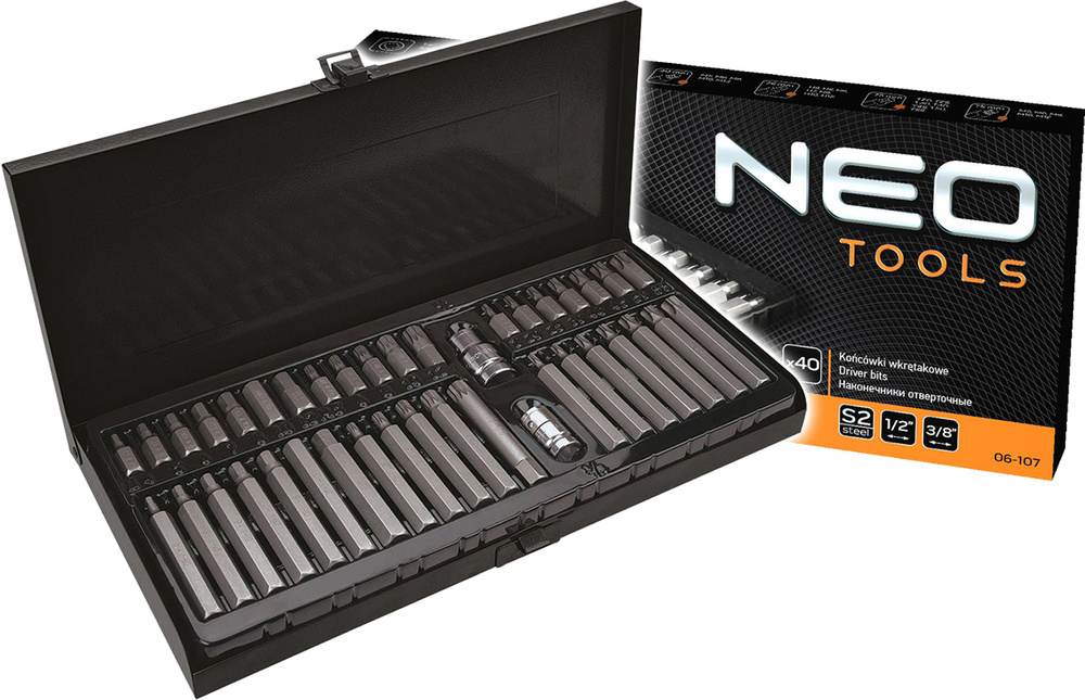 Zestaw końcówek wkrętakowych marki NEO to esencja jakości i funkcjonalności. Obejmując 40 elementów wykonanych z wytrzymałej stali chromowo-wanadowej, oferuje szeroką gamę końcówek sześciokątnych, Torx i Spline w dwóch różnych długościach (30 mm i 75 mm), zapewniając wszechstronność w różnorodnych zastosowaniach. Dzięki dołączonym redukcjom 1/2" i 3/8", zestaw gwarantuje kompatybilność z większością narzędzi. Solidna kasetka ułatwia organizację i transport, a 25-letnia gwarancja producenta podkreśla niezawodność i trwałość produktu.