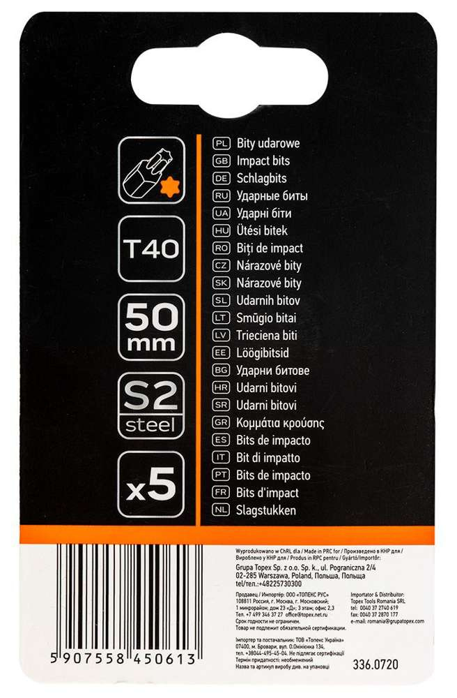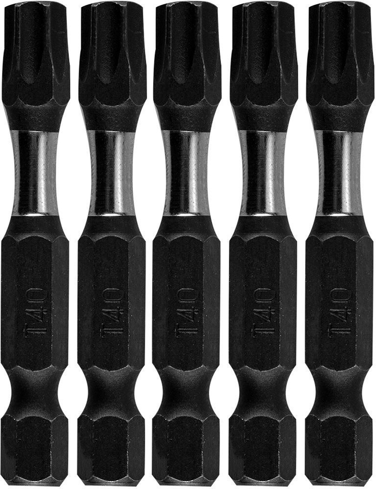Bity udarowe S2, 50 mm, 09-587, NEO, zwane też grotami, to zestaw 5 profesjonalnych bitów udarowych typ T40. Przeznaczone są do wkrętarek 1/4”. Mają system, który zabezpiecza je przed wyślizgnięciem grota z wkręta. Groty wykonane są z najwyższej jakości stali narzędziowej S2, metodą kucia na zimno. Połączenie wysokiej jakości materiału oraz metody kucia grotów pozwalają na osiągnięcie wysokiego momentu dokręcania równego 21,8 Nm. System absorbcji momentu zabezpiecza końcówki przed szybkim zużywanie i znacznie przedłuża ich żywotność.