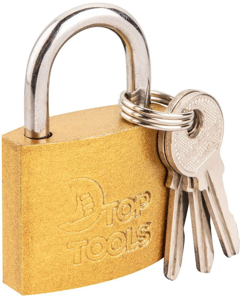 Żeliwna kłódka z miedziana powłoką Top Tools (nr ref. 90U270) o szerokości korpusu 30 mm. W komplecie 3 klucze.