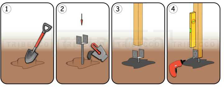- Łącznik wmurowuje się w podstawę betonową, wkłada słupek, a następnie przykręca słupek do łącznika.