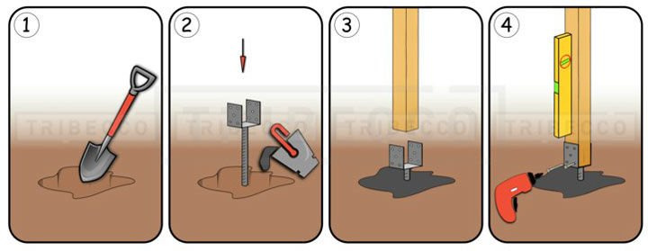 - Łącznik wmurowuje się w podstawę betonową, wkłada słupek, a następnie przykręca słupek do łącznika.