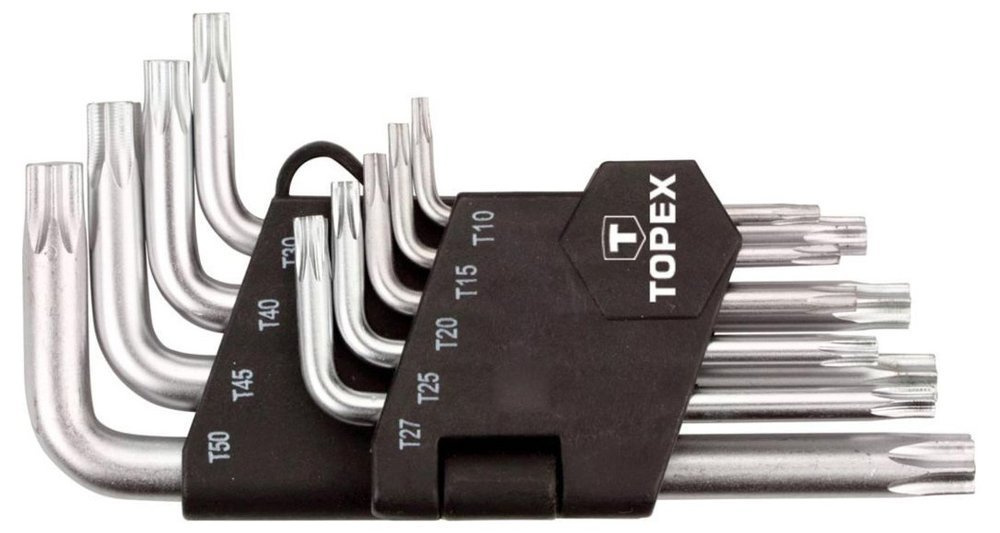 Klucze Torx krótkie TOPEX (nr ref. 35D960) wykonane z wytrzymałej stali chromowo-wanadowej, zapewniającej długą żywotność produktu. Praktyczne opakowanie z tworzywa sztucznego, z oznaczoną przegródką na każdy klucz, ułatwia ich przechowywanie. Marka TOPEX skierowana jest do majsterkowiczów.