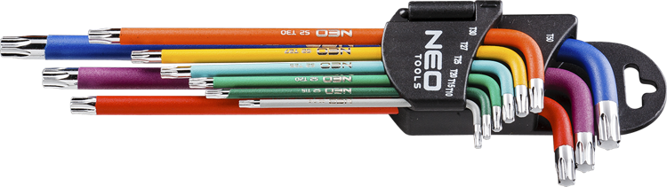 - Zestaw kluczy Torx NEO zawiera 9 kluczy w rozmiarze od T10 do T50. Wysokogatunkowa stal SNCM+V zapewnia długoletnią wytrzymałość. Każdy rozmiar klucza oznaczony jest innym kolorem, co ułatwia szybki wybór właściwego rozmiaru podczas pracy.