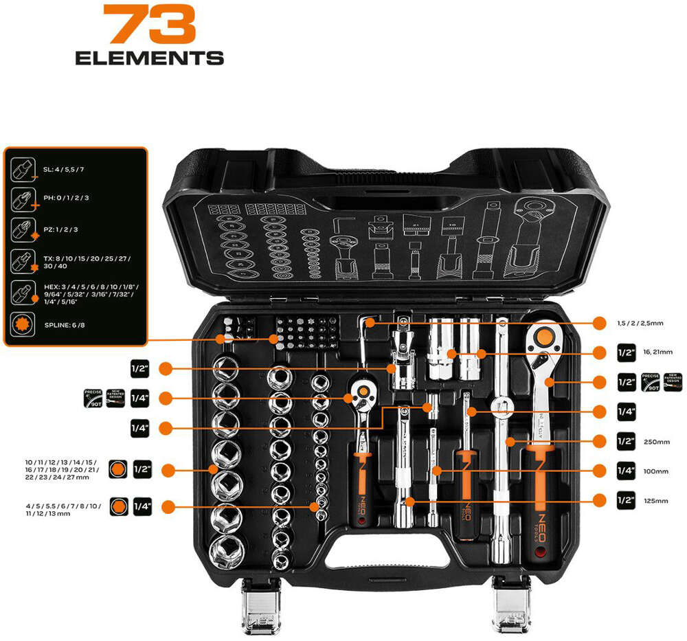 Zestaw kluczy nasadowych 1/2" i 1/4" 73 elementów Neo 10-054