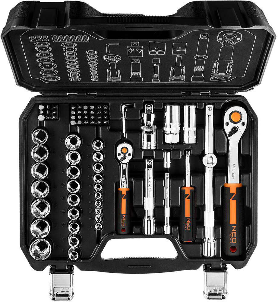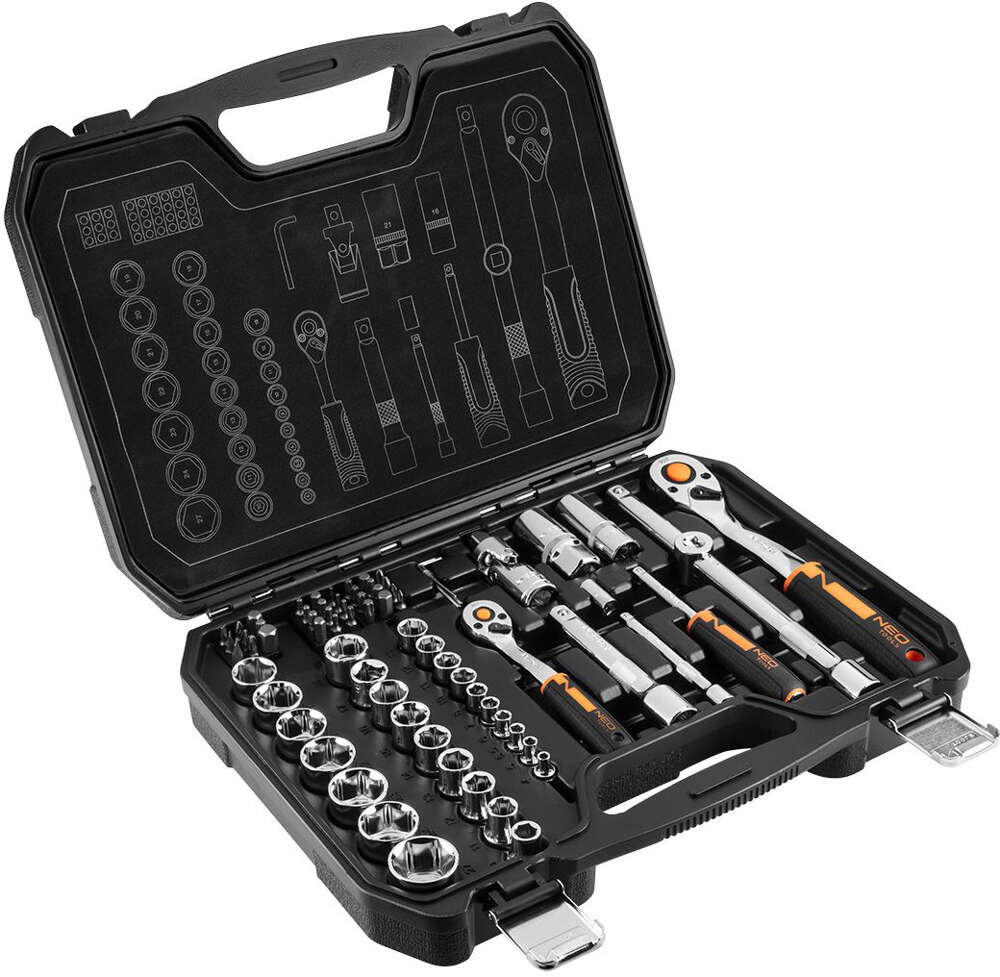Klucze nasadowe 1/2" i 1/4", zestaw 73 sztuk, CRV, 10-054 NEO to wysokiej jakości komplet 73 sztuk produktów, oferowanych w wygodnej walizce z tworzywa sztucznego z metalowymi zatrzaskami oraz poręcznym uchwytem. Umieszczenie w niej wertykalnie elementów gwarantuje większą wygodę korzystania oraz szybsze skompletowanie wymaganych przyborów