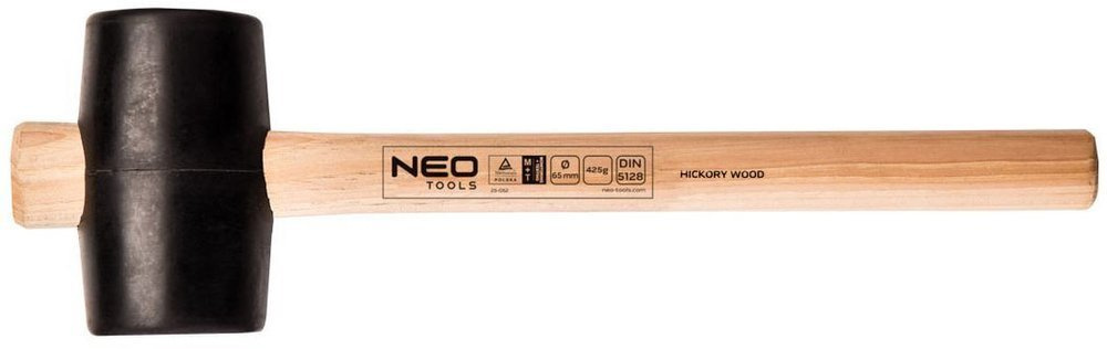 Młotek gumowy NEO (nr ref. 25-052) o masie 425 g i średnicy obucha 65 mm znajduje swoje zastosowanie głównie podczas prac budowlanych, wykończeniowych, montażowych i blacharskich, ponieważ guma nie uszkodzi kruchego materiału. Trzonek wykonany z wytrzymałego drewna hikorowego. Gumowy obuch zamocowany za pomocą klinu na stożkowym trzonku, co zapewnia bezpieczeństwo podczas użytkowania. Gwarantem wysokiej jakości i niezawodności produktu jest certyfikat TÜV Rheinland. Marka NEO spełnia oczekiwania profesjonalistów.