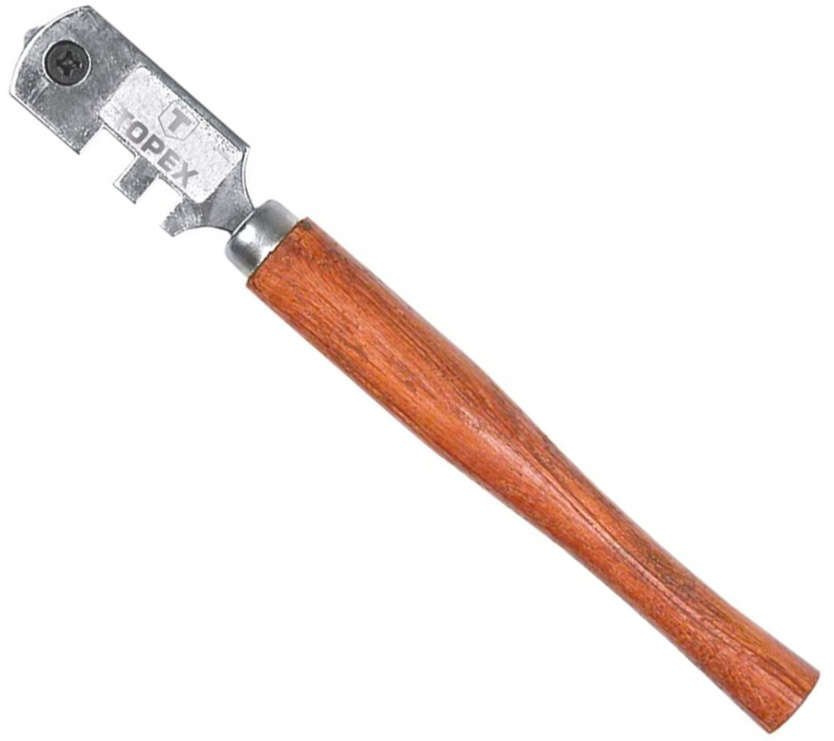 Nóż do szkła TOPEX (nr ref. 14A710) to proste narzędzie do cięcia szkła. Wyposażony w sześć wymiennych kółek tnących, co zapewnia długą żywotność. Drewniana rączka dobrze układa się w dłoni, dzięki czemu praca nożem staje się wygodniejsza. Zaletą produktu są uchwyty do łamania szkła usytuowane na głowicy, bardzo przydatne podczas cięcia. Marka TOPEX skierowana jest do majsterkowiczów.