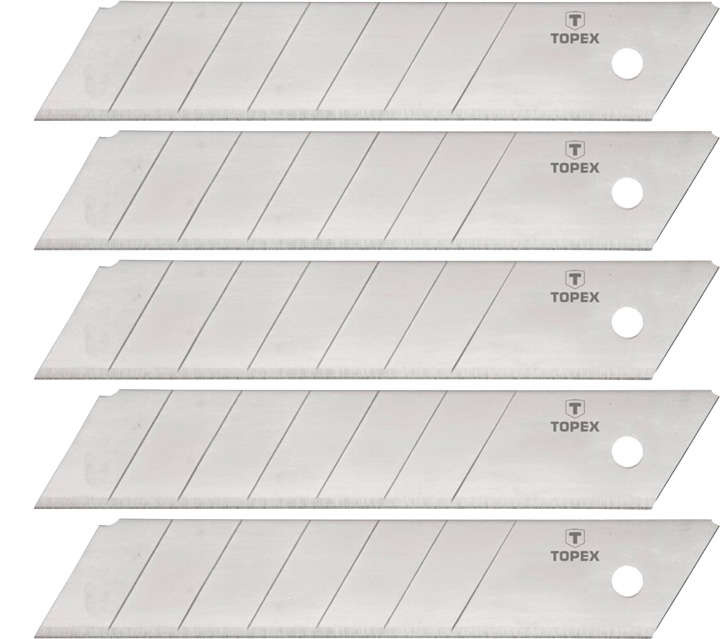 Ostrza łamane wymienne TOPEX (nr ref. 17B550) o szerokości 25 mm to wymienne części do noży. W komplecie znajduje się 5 sztuk. Marka TOPEX skierowana jest do majsterkowiczów.