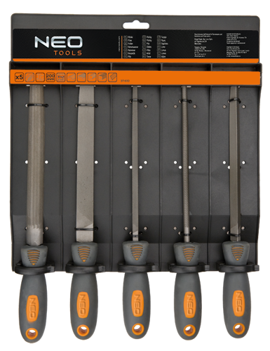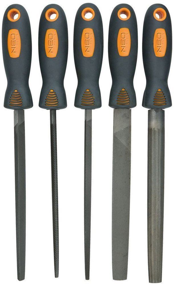 - Zestaw 5 pilników do metalu NEO o różnych przekrojach (płaskim, kwadratowym, trójkątnym, półokrągłym i okrągłym), Długotrwałe użytkowanie zapewnia wysokiej jakości stal stopowa.