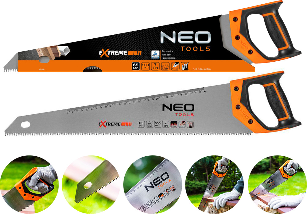 Rękojeść piły jest samodzielnym projektem techników NEO i została objęta patentem. Uchwyt jest miękki i lekki, co sprawdza się w czasie pracy, ponieważ ręka jest mniej obciążona.