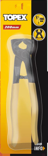 Szczypce do glazury TOPEX (nr ref. 16B441) o długości 200 mm. Przeznaczone do łamania glazury. Rękojeść pokryta tworzywem winylowym zapobiega wyślizgiwaniu się z dłoni, co poprawia komfort pracy. Marka TOPEX skierowana jest do majsterkowiczów.