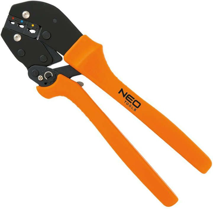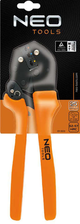 Szczypce do zaciskania końcówek konektorowych NEO (nr ref. 01-503) o długości 250 mm. Kody kolorystyczne ułatwiają wybór średnicy końcówki. Do końcówek w zakresie 22-10 AWG. Twardość szczęk zaciskających 48-52 HRC. Uchwyt pokryty wysokiej jakości tworzywem TPR podnosi komfort pracy. Jakość narzędzia potwierdzona certyfikatem TÜV i 25-letnią gwarancją producenta. Marka NEO spełnia oczekiwania profesjonalistów.