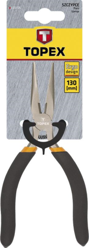 Szczypce precyzyjne wydłużone proste TOPEX (nr ref. 32D726) o długości 130 mm. Wykonane z hartowanej stali, dodatkowo powierzchnie tnące hartowane indukcyjnie. Ergonomiczne uchwyty, pokryte antypoślizgowym materiałem zapewniają wygodę i bezpieczeństwo podczas pracy. Produkt jest doskonale dopasowany do kształtu dłoni. Szczypce posiadają sprężynę, która zapewnia odbijanie ramion poprawiając komfort pracy narzędziem. Marka TOPEX skierowana jest do majsterkowiczów.