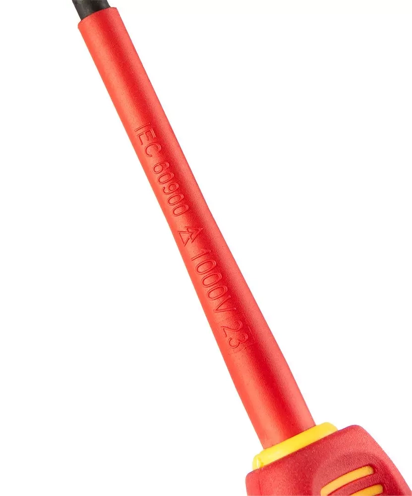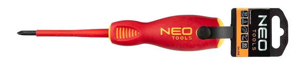 Izolowany wkrętak plus-minus od marki NEO, posiadający certyfikat do pracy pod napięciem do 1000 V. Wyposażony w długość grota 80 mm oraz rozmiar końcówki SL/PH1. Polecany m.in. do przykręcania bezpieczników do szyny. Wkrętak wykonany został z solidnej stali chromowo-wanadowej w części roboczej. Jego końcówka została poddana dodatkowej obróbce cieplnej w celu zwiększenia twardości oraz odporności na zgięcia.