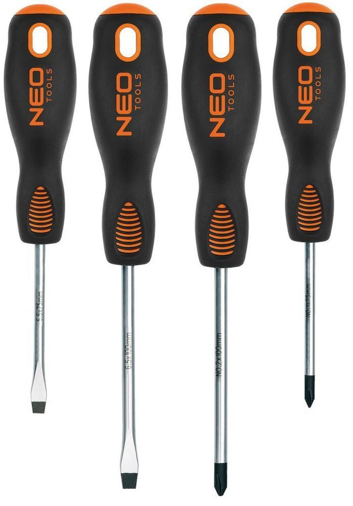 - Zestaw wkrętaków NEO zawiera 4 wkrętaki: płaskie i krzyżowe. Grot wkrętaka wykonany jest z wyjątkowo wytrzymałej stali chromowo-molibdenowej.