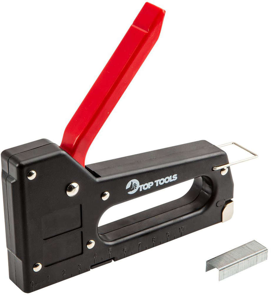 Zszywacz tapicerski Top Tools (nr ref. 41E901) na zszywki J w rozmiarze 6-8mm. Doskonale sprawdza się przy pracach tapicerskich i dekoratorskich, mocowaniu folii czy skóry.