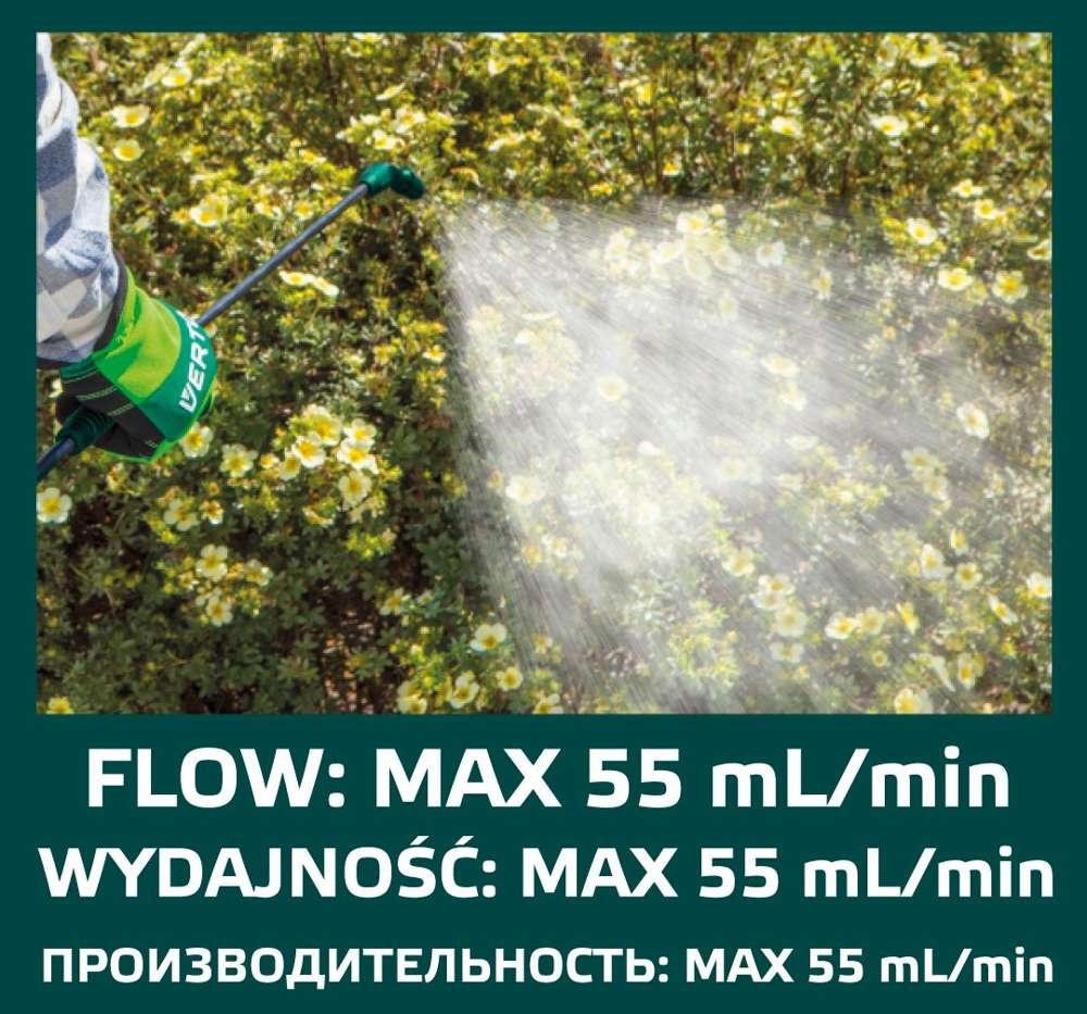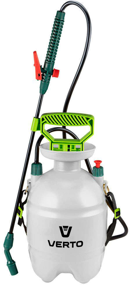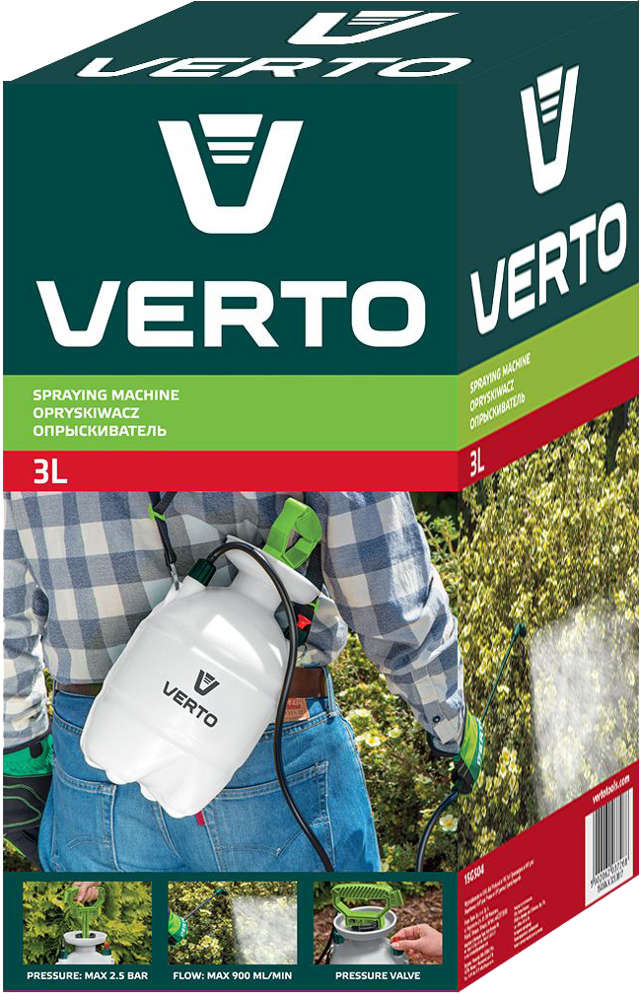 Opryskiwacz ciśnieniowy VERTO (nr ref. 15G504) o pojemności 3 litrów. Ciśnienie robocze 2.5 - 3 bary. Szeroka szyjka ułatwia napełnianie butli. Dodatkowy pasek umożliwiający zawieszenie zraszacza na ramieniu oraz blokada strumienia podnoszą komfort pracy. Zawór zapewnia bezpieczeństwo w trakcie użytkowania. Opryskiwacz można stosować w zakresie temperatur od 0 do + 45°C.