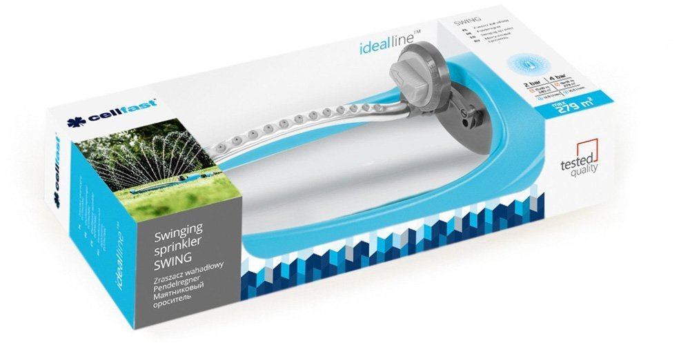 Zraszacz wahadłowy Swing Ideal to nowoczesne urządzenie przeznaczone do nawadniania trawników i innych powierzchni w ogrodzie o powierzchni do 279 m2. Jest elementem linii urządzeń do nawadniania Cellfast Ideal. Zraszacz wyposażony jest w 15 trwałych dysz.