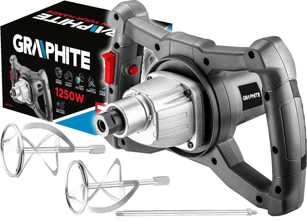 Mieszarka elektryczna GRAPHITE z silnikiem o mocy 1250 W, przeznaczona do mieszania masy gipsowej, zapraw klejowych lub farb. Mieszarka dzięki wytrzymałej konstrukcji oraz wydajnemu systemowi odprowadzania ciepła przystosowana jest do pracy ciągłej przy pracach wykończeniowych na średnich placach budowy. Mieszarka posiada możliwość regulacji prędkości obrotowej wrzeciona. Odpowiednio wyprofilowana rękojeść urządzenia pozwala na wygodną i bezpieczną pracę przez długi czas. Również dla bezpieczeństwa mieszarka została wyposażona w blokadę, uniemożliwiającą przypadkowe włączenie. W zestawie z mieszarką znajdują się dwa mieszadła, jeden trzpień oraz dwa klucze.