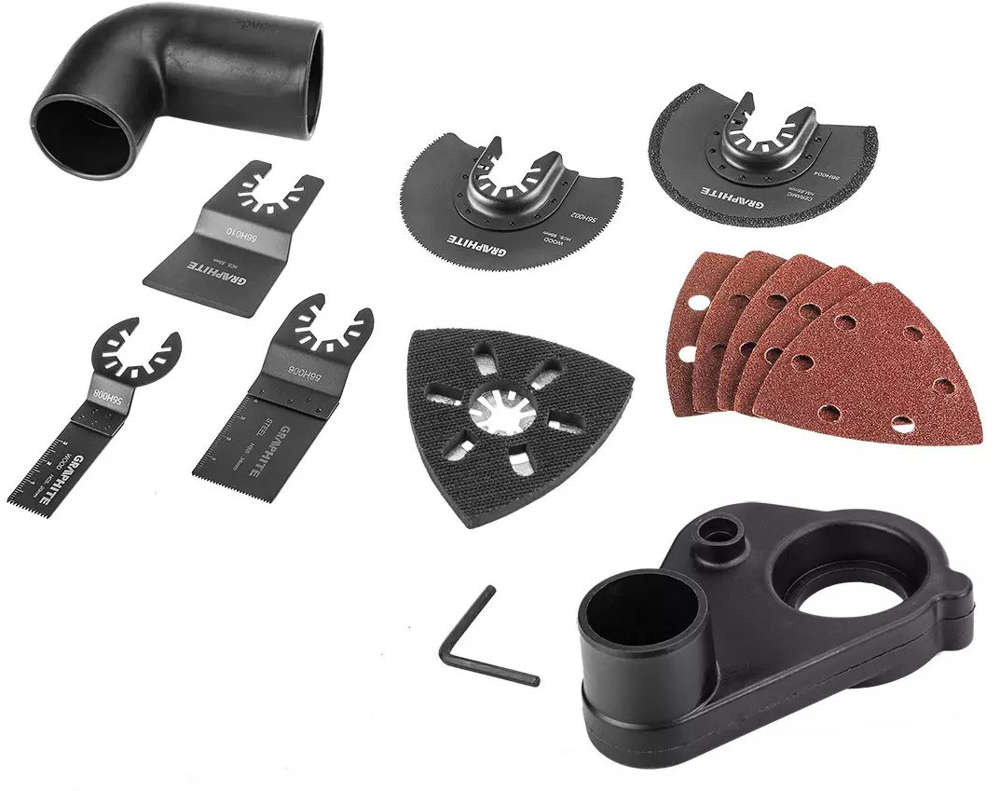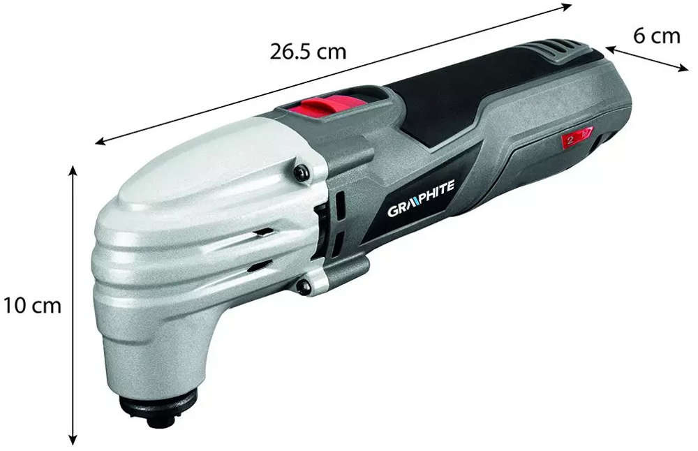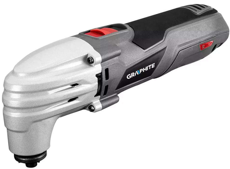 Urządzenie wielofunkcyjne 250 W GRAPHITE to uniwersalne urządzenie o wielu przeznaczeniach, zasilane sieciowo. Szlifierka wielofunkcyjna oferuje możliwość cięcia, szlifowania czy skrobania rozmaitych materiałów (drewna, metalu lub ceramiki). Głowica wykonuje od 15 000 do nawet 21 000 oscylacji na minutę, a kąt jej działania wynosi 3,2°.