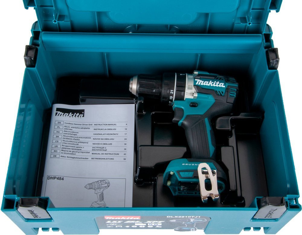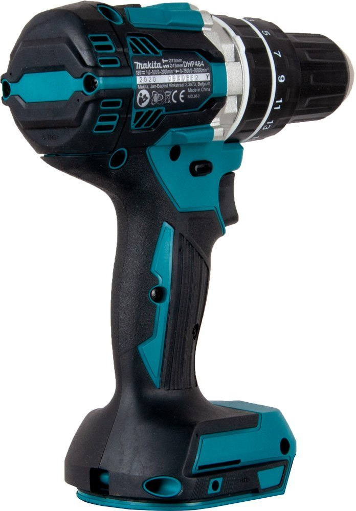 Dwubiegowa wiertarko-wkrętarka akumulatorowa udarowa 18V LXT MAKITA DHP484Z zasilana profesjonalnymi akumulatorami z serii MAKITA LXT 18V o maksymalnym momencie dokręcania 54 Nm. Wyposażona w szybkomocujący uchwyt wiertarski oraz 2 diody LED oświetlające obszar roboczy z opóźnionym wygaszaniem. Urządzenie wykonane w technologii XPT która zapewnia podwyższoną odporność na pył i wilgoć. Podzespoły przekładni wykonane z metalu. Doskonała do użytku profesjonalnego oraz zastosowań amatorskich. W tym zestawie wiertarko-wkrętarka sprzedawana jest bez akumulatorów i ładowarki. Przeznaczona dla użytkowników którzy posiadają już ładowarkę i akumulatory 18V z profesjonalnej serii LXT np.: MAKITA BL1815N, BL1820, BL1820B, BL1830, BL1830B, BL1840, BL1840B, BL1850, BL1850B, BL1860B.