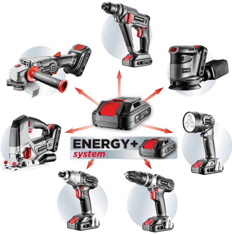 - Dwubiegowa wiertarko-wkrętarka GRAPHITE, współpracująca z akumulatorami 18V Li-Ion GRAPHITE Energy+.