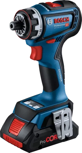 GSR 18V-90 FC Professional to wyjątkowo wszechstronna wiertarko-wkrętarka akumulatorowa, będąca częścią systemu FlexiClick Bosch Professional. Dzięki wymiennym uchwytom użytkownik zyskuje maksymalną elastyczność – może pracować w trudno dostępnych miejscach przy krawędziach i ścianach, a także przekształcić narzędzie w wiertarkę kątową lub nawet młot udarowo-obrotowy SDS plus (po zamontowaniu uchwytu GFA 18-H). Uchwyt można blokować w 16 różnych pozycjach pod kątem 360°, bez konieczności jego zdejmowania.