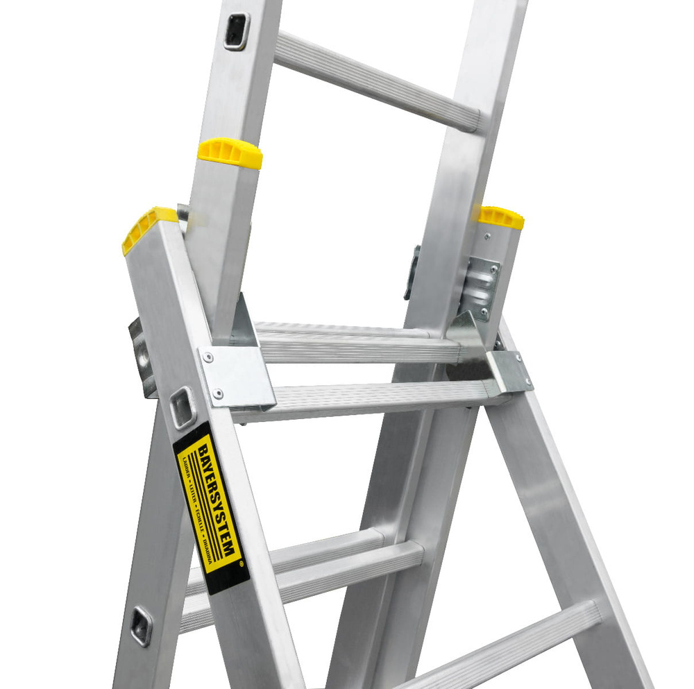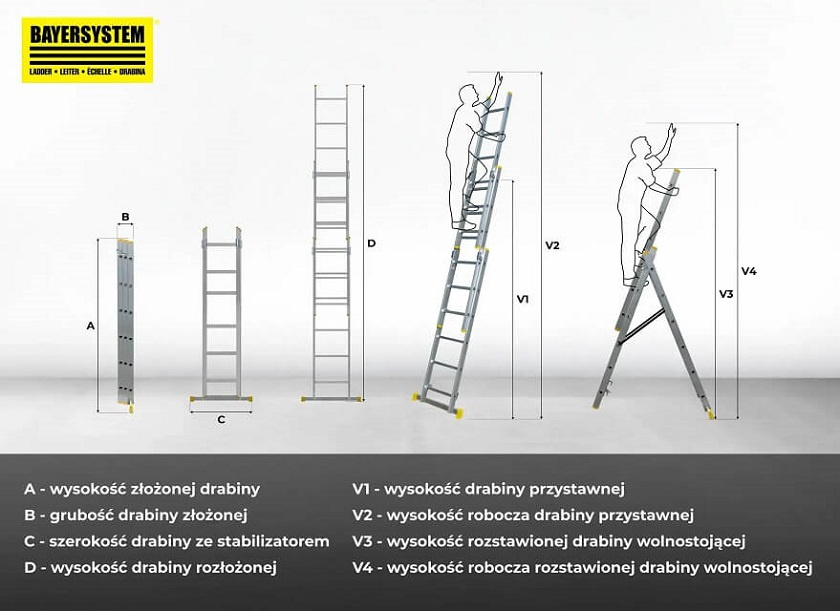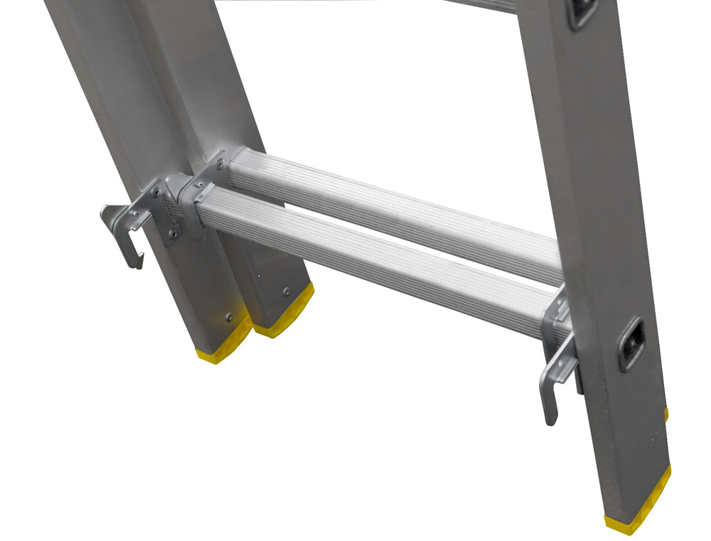 Antypoślizgowe stopnie, szeroki stabilizator oraz stopki z tworzywa sztucznego zapewniają bezpieczeństwo nawet w trudnych warunkach. Pasek zabezpieczający chroni przed niekontrolowanym rozsunięciem. Trzyelementowa konstrukcja pozwala na oddzielne wykorzystanie jednego przęsła jako drabiny przystawnej, co zwiększa jej wszechstronność.