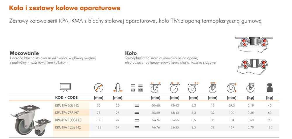 Zestawy kołowe skrętne z hamulcem serii KPA-TPA, mocowane na tzw. płytkę są połączeniem widelca aparaturowego wykonanego z tłoczonej blachy stalowej ocynkowanej oraz koła z piastą polipropylenową i oponką termoplastyczną z szarej niebrudzącej gumy.