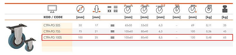 Zestawy kołowe skrętne serii CTPA-PG, mocowane na tzw. płytkę są połączeniem widelca aparaturowego wykonanego z tłoczonej blachy stalowej oraz koła z piastą polipropylenową i oponką z szarej niebrudzącej gumy.