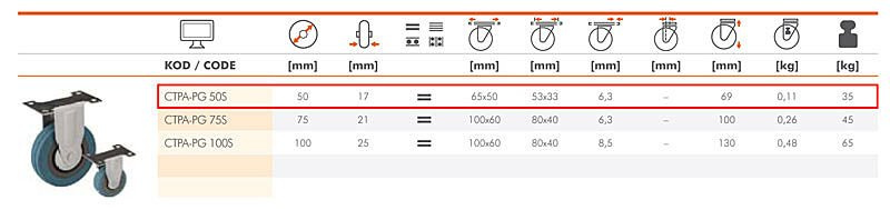 Zestawy kołowe skrętne serii CTPA-PG, mocowane na tzw. płytkę są połączeniem widelca aparaturowego wykonanego z tłoczonej blachy stalowej oraz koła z piastą polipropylenową i oponką z szarej niebrudzącej gumy.