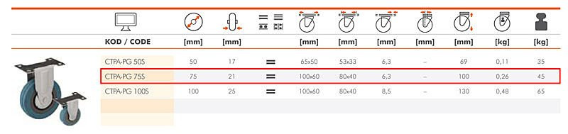 Zestawy kołowe skrętne serii CTPA-PG, mocowane na tzw. płytkę są połączeniem widelca aparaturowego wykonanego z tłoczonej blachy stalowej oraz koła z piastą polipropylenową i oponką z szarej niebrudzącej gumy.