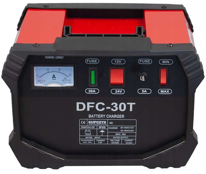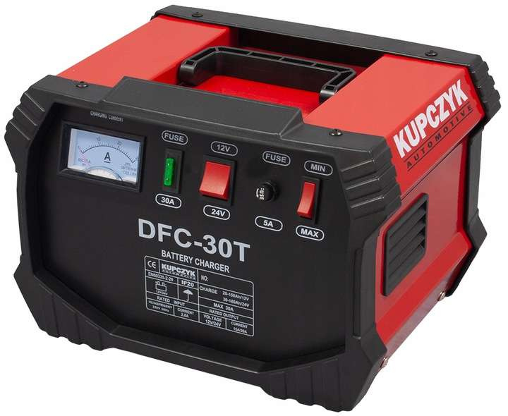 Prostownik do ładowania akumulatorów Kupczyk DFC-30T przeznaczony jest do ładowania akumulatorów kwasowych prądem o natężeniu 12V lub 24V. Urządzenie wyposażone i intuicyjny panel sterowania z praktycznym wychyłowym (analogowym) wyświetlaczem. Na panelu znajdują się wygodne przełączniki: 12V/24V oraz przyciski wolnego i szybkiego ładowania. Ponadto prostownik posiada bezpiecznik chroniący przed przeciążeniem. Dodatkowym atutem jest kompaktowa budowa urządzenia oraz praktyczny uchwyt do przenoszenia.