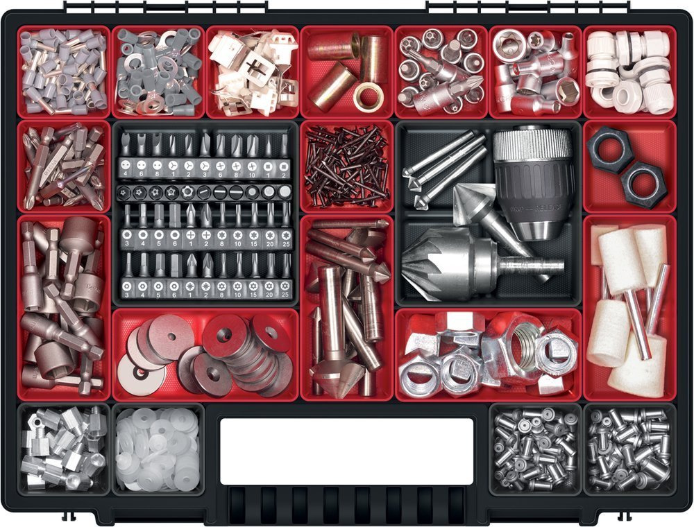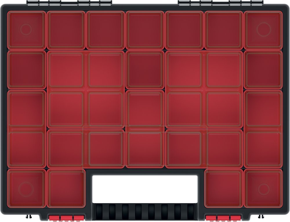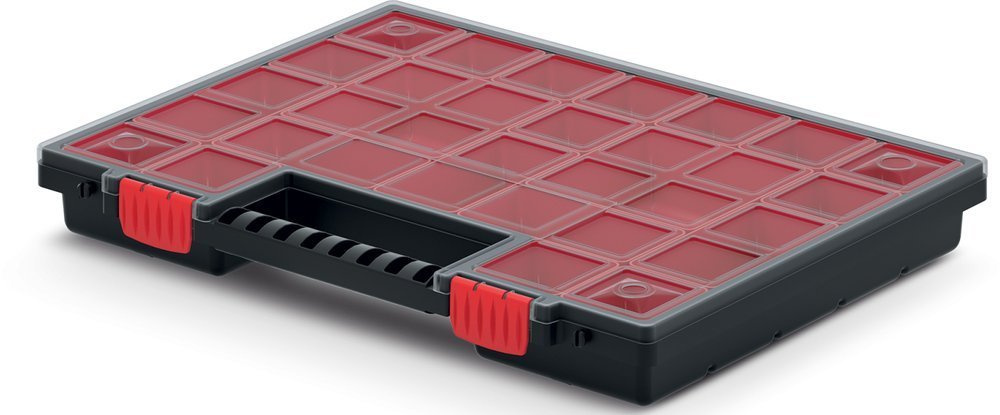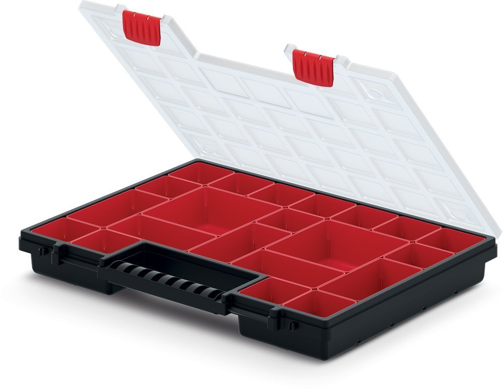 Płaski organizer, zamykany organizer z boczną rączką o wymiarach 399mm x 303mm x 50 mm. Posiada kolorowe pojemniki o różnych rozmiarach, które można swobodnie wyjmować. Służy do przechowywania różnych drobnych elementów. Dzięki systemowi szczelnej pokrywy zawartość po przechyleniu nie wysypie się z swoich przegródek.