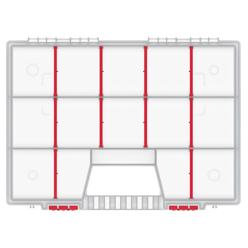 Praktyczny i pojemny organizer z trzema rzędami przegródek umożliwia umieszczenie ogromnej ilości drobnych przedmiotów takich jak gwoździe, kołki rozporowe, wkręty, śruby i nakrętki, wiertła itp. Organizer marki Kistenberg to nie tylko świetne rozwiązanie w garażu lub warsztacie, ale także fantastyczny pomocnik w utrzymaniu porządku w domu lub mieszkaniu. Każda Pani domu doceni jego możliwości - bez trudu poukłada i uporządkuje guziki, nitki, wstążki, gumki i inne tak niezbędne drobiazgi.