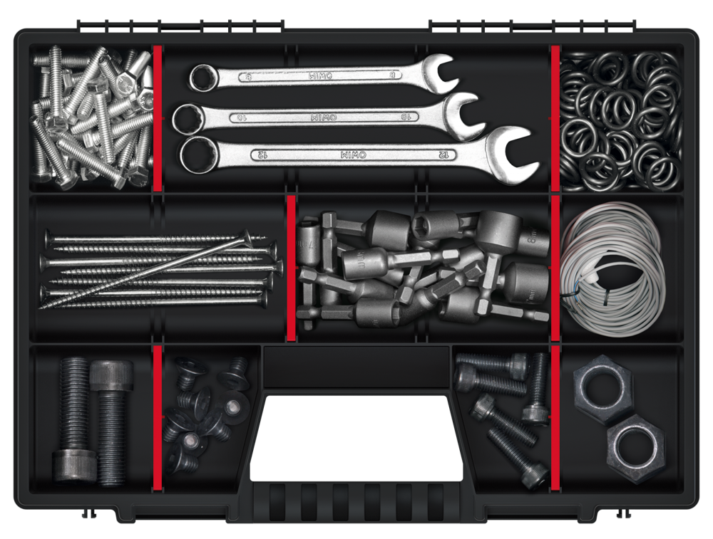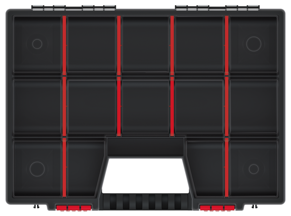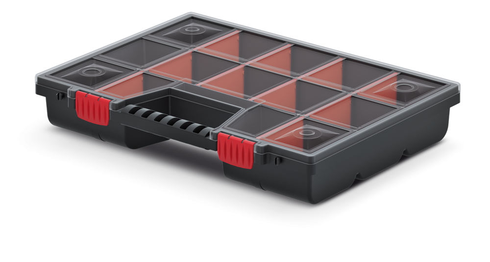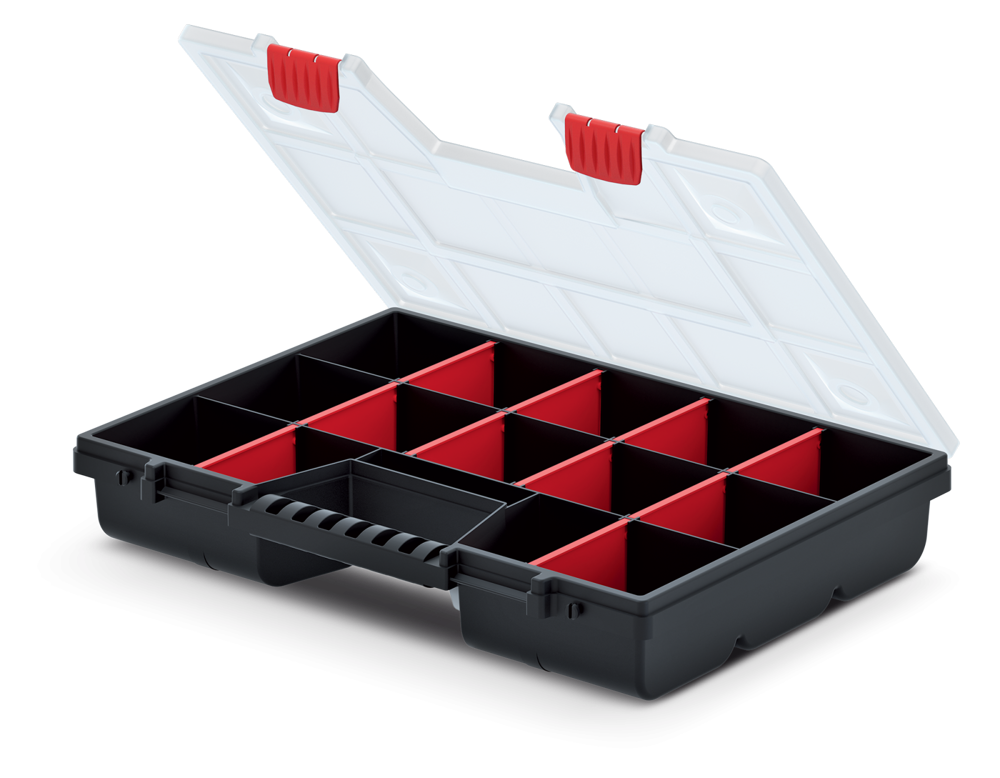 Praktyczny i pojemny organizer z trzema rzędami przegródek umożliwia umieszczenie drobnych przedmiotów takich jak gwoździe, kołki rozporowe, wkręty, śruby i nakrętki, wiertła itp. Organizer marki Kistenberg to nie tylko świetne rozwiązanie w garażu lub warsztacie, ale także fantastyczny pomocnik w utrzymaniu porządku w domu lub mieszkaniu. Każda Pani domu doceni jego możliwości - bez trudu poukłada i uporządkuje guziki, nitki, wstążki, gumki i inne tak niezbędne drobiazgi. Przegrody mają możliwość regulacji długości, co pozwala dopasować wielkość przegródek do potrzebnej wielkości. Dzięki przezroczystej pokrywie bez otwierania organizera można rozpoznać jego zawartość. Szeroka rączka oraz solidne zatrzaski do zamykania to kolejne atuty praktycznego organizera. Produkt został wykonany z wysokiej jakości materiałów, co zapewnia jego trwałość i wytrzymałość.