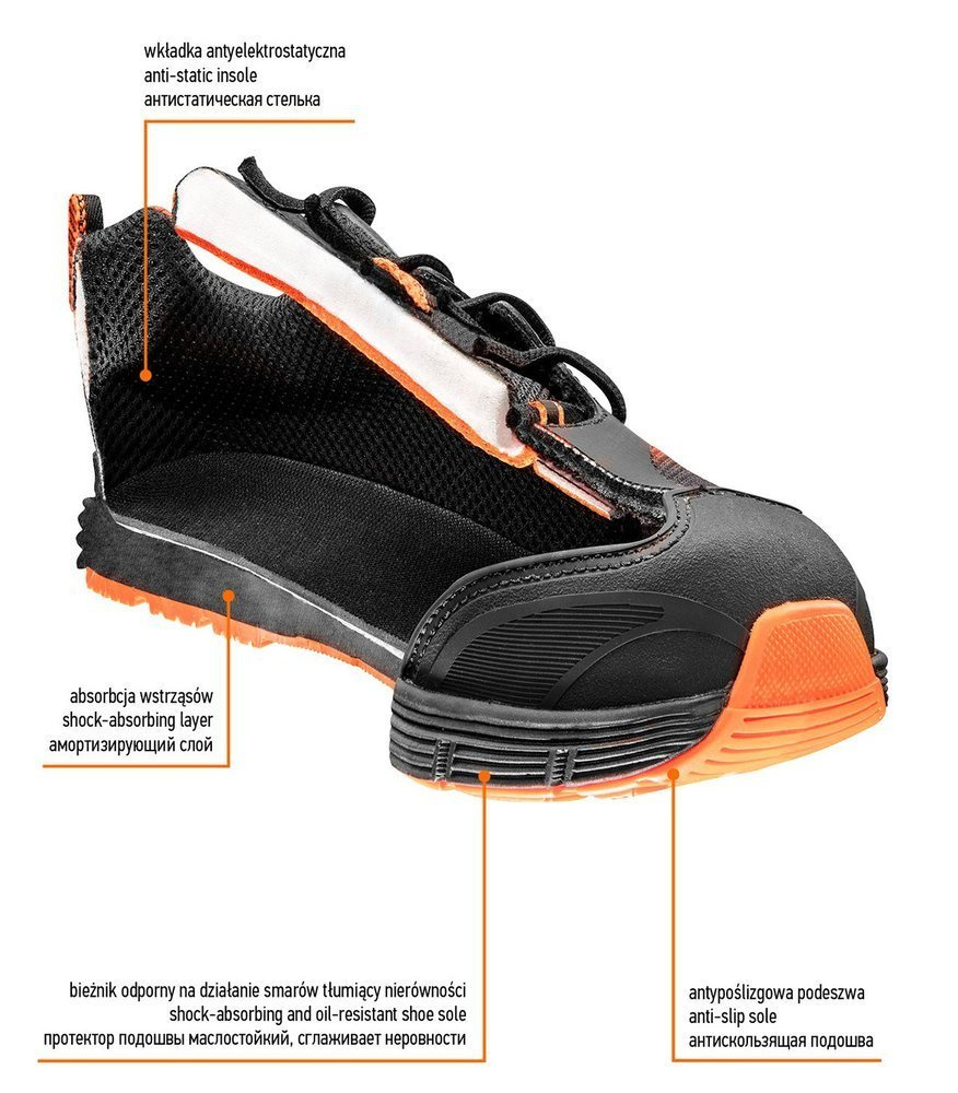 Półbuty zawodowe NEO to podstawowa ochrona podczas pracy. Cholewka wykonana z oddychającego materiału. Antypoślizgowa podeszwa wykonana z pianki EVA pokrytej gumą zapewnia wysoki komfort i skuteczne amortyzowanie wstrząsów, gwarantuje bezpieczeństwo i wygodę. Dzięki miękkiemu wykończeniu wewnątrz buta komfort pracy pozostaje na wysokim poziomie.