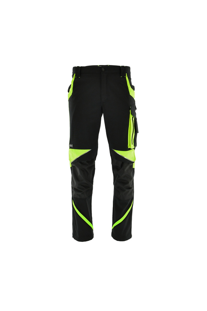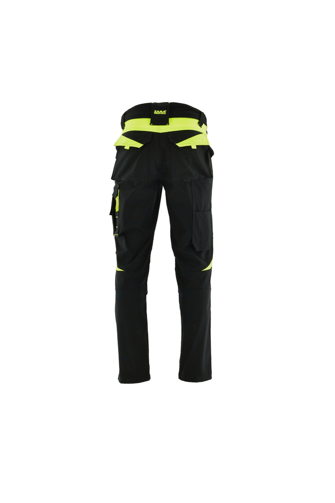 - kieszenie na nakolanniki kryte dwukolorowymi patkami z wszytą srebrną, odblaskową wypustką z logo SARA WORKWEAR, zapinane na rzepy