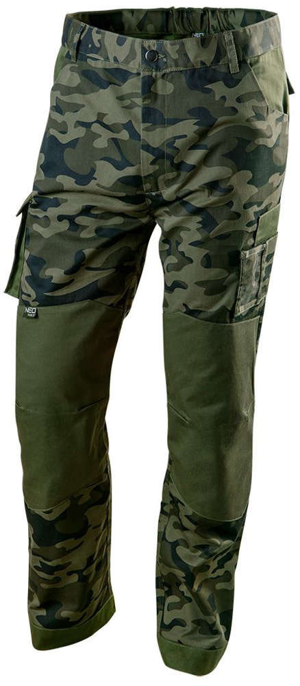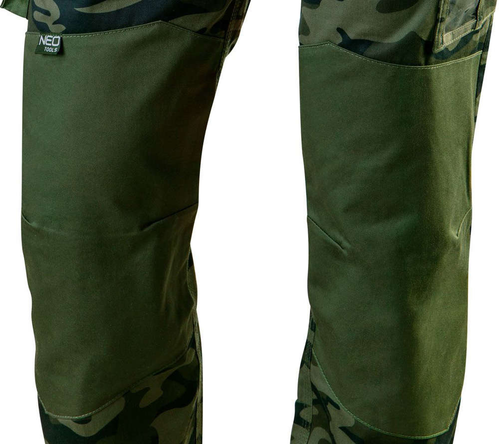 Spodnie robocze NEO z serii CAMO wykonane są z wysokiej jakości bawełniano- poliestrowej tkaniny. Profilowane kolana z kieszeniami na nakolanniki ochronne oraz pojemne i wytrzymałe kieszenie znacznie podnoszą komfort pracy. Elastycznym elementy umieszczone w pasie pozwalają na lepsze dopasowanie rozmiaru. Potrójne szwy wewnętrzne zwiększają odporność na rozerwania. Spodnie wyróżnia unikalny wzór moro. Modna kolorystyka oraz nowoczesny fason pozwalają na użytkowanie produktu również poza pracą. Gwarantem jakości jest certyfikat europejski oraz wykonanie zgodne z normą EN ISO 13688:2013. Marka NEO spełnia oczekiwania profesjonalistów.